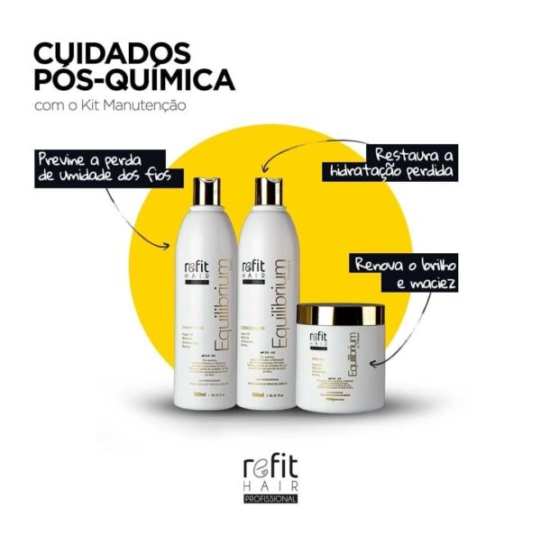 Cronograma Capilar, Kit ManutençãoO kit Manutenção Equilibrium ajuda a restaurar a hidratação perdida e suavização do toque. Previne a perda de umidade dos fios e auxilia na manutenção da saúde da fibra capilar no cuidado diário, renova o brilho e maciez.